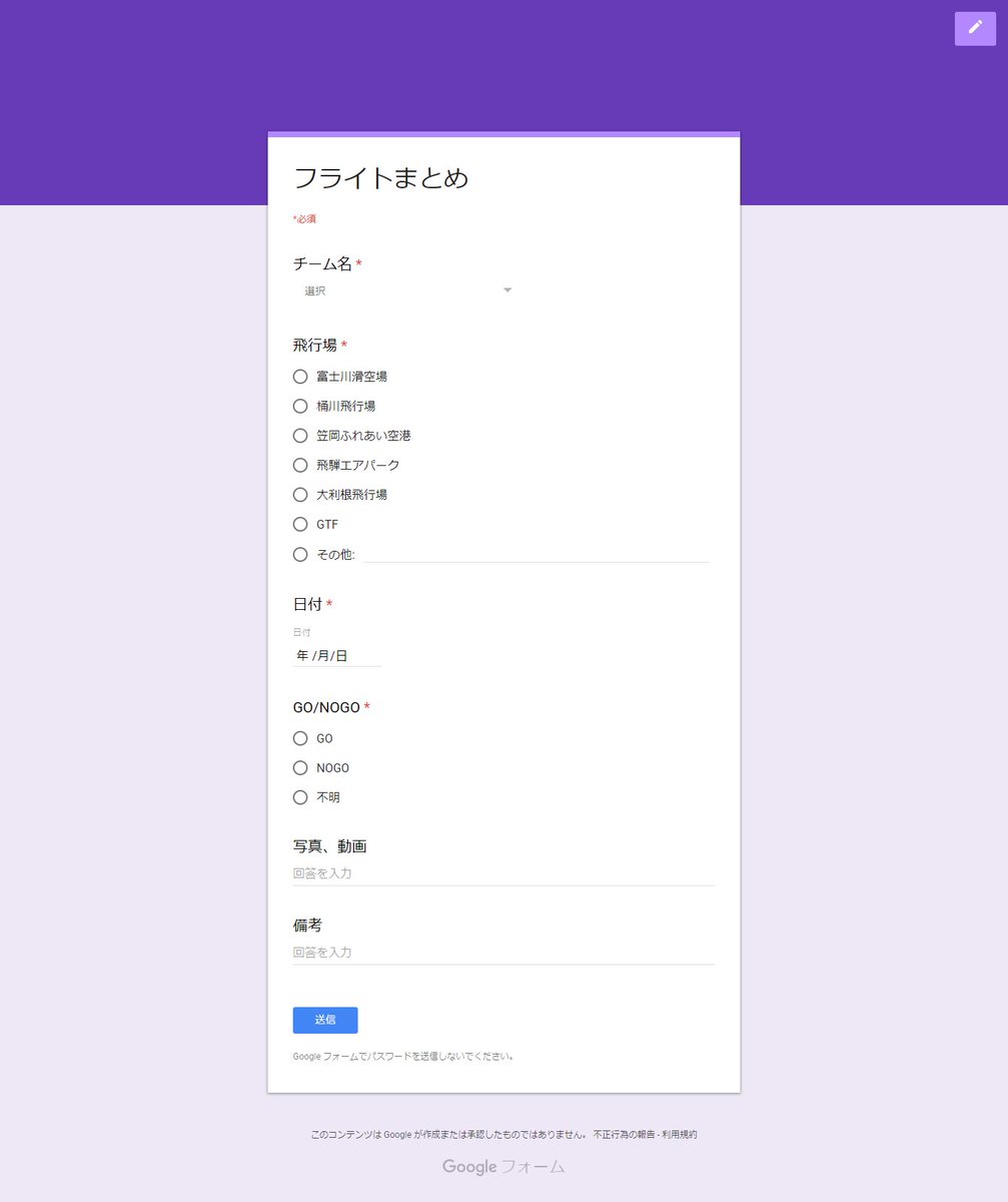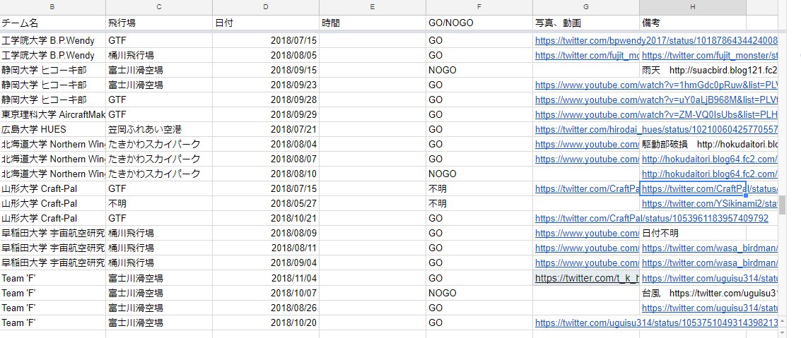 日時、チーム名、利用した飛行場、その日の動画や画像(ある場合)をまとめます。